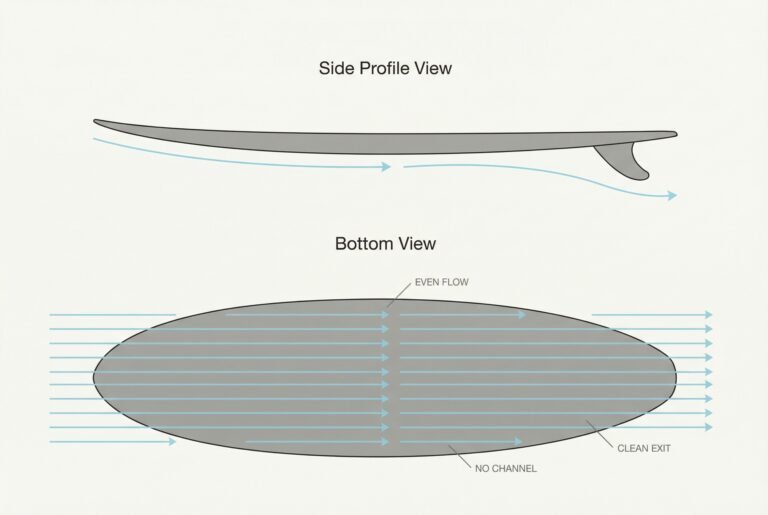 A flat bottom allows water to pass beneath the board with minimal interruption.